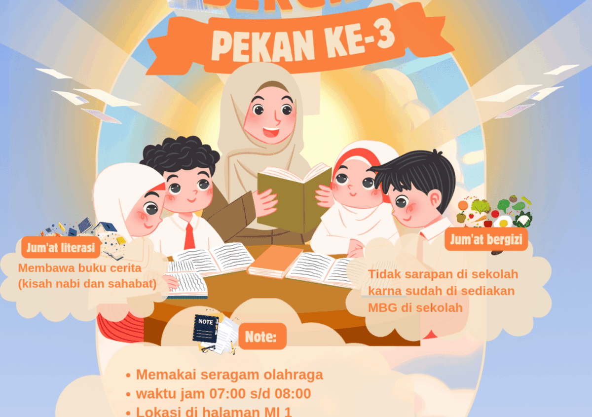 *Assalamu'alaikum Warahmatullahi Wabarakatuh* *INFO JUM'AT KREATIF* (19 September 2025) *Kelas I, V, dan VI* Kegiatan Jum'at Kreatif besok adalah Jum'at Ke-3 dibulan September yaitu *JUM'AT LITERASI & JUM'AT BERGIZI*(Sarapan Sehat MBG), jangan lupa : 1. Memakai Seragam Olahraga 2. Membawa Buku Cerita / Buku Kisah-kisah Nabi dan Sahabat 3. Waktu : 07.00 s/d 08.00 WIB (setelah selesai jumat kreatif, dilanjut belajar seperti biasa) 4. Lokasi : Halaman MI 1. (Pembiasaan Diri di Halaman Sekolah) 5. Siapkan Infaq Jum'at terbaiknya 6. Kelas 5 dan Kelas 6 Al-Amin bisa diantar langsung ke Gedung MI 1. Tembusan : 1. Kepala Madrasah 2. Bidang Kesiswaan *CATATAN* : 1. Tidak perlu membawa Bekal dari rumah, karena sudah dapat MBG 😊 2. Dirumah jangan sarapan terlebih dahulu, kita sarapan bersama-sama di sekolahan. 😊 Terimakasih🙏🏻🙏🏻 *Wassalamu’alaikum Warahmatullahi Wabarakatuh*