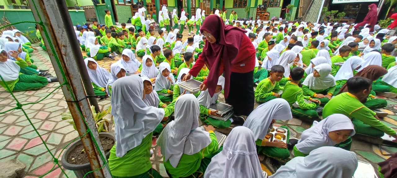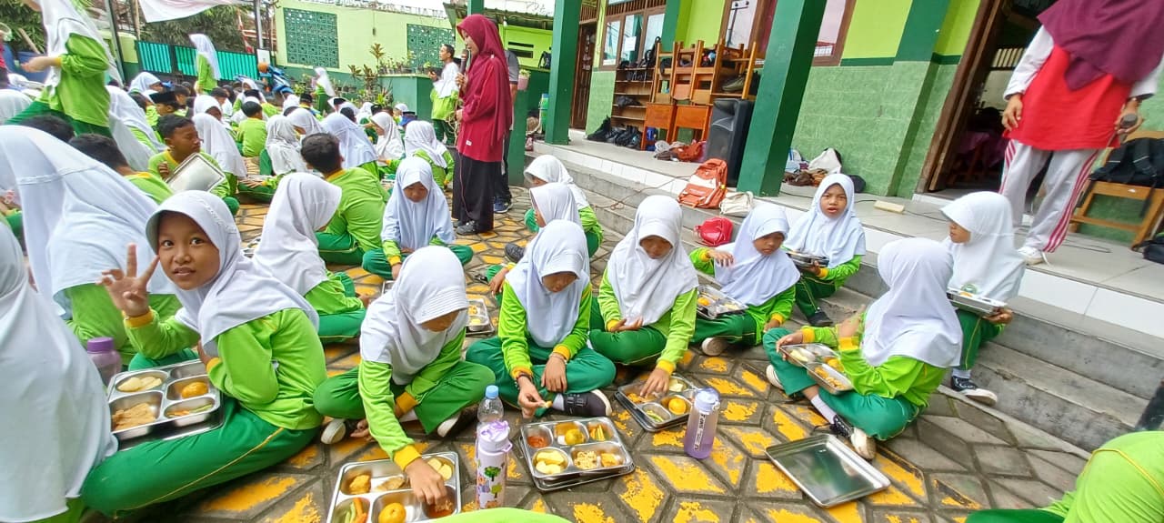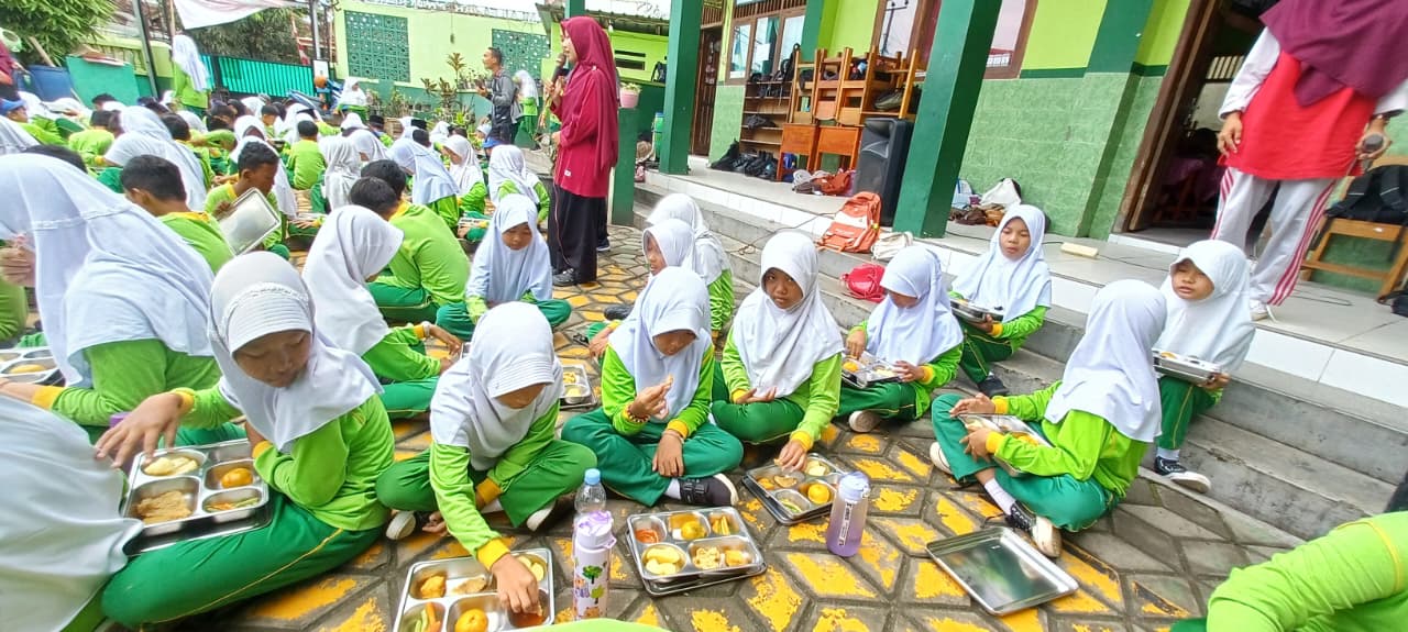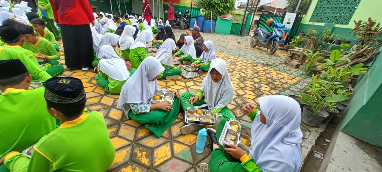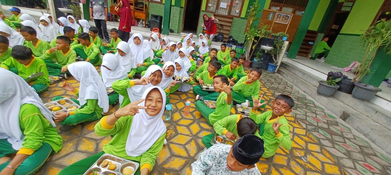 Suasana kegiatan terlihat penuh kegembiraan. Para siswa tampak antusias dan bahagia saat menikmati makanan yang disediakan. Guru-guru dan staf madrasah turut mendampingi serta memberikan edukasi tentang pentingnya memilih makanan bergizi dan menjaga pola hidup sehat.