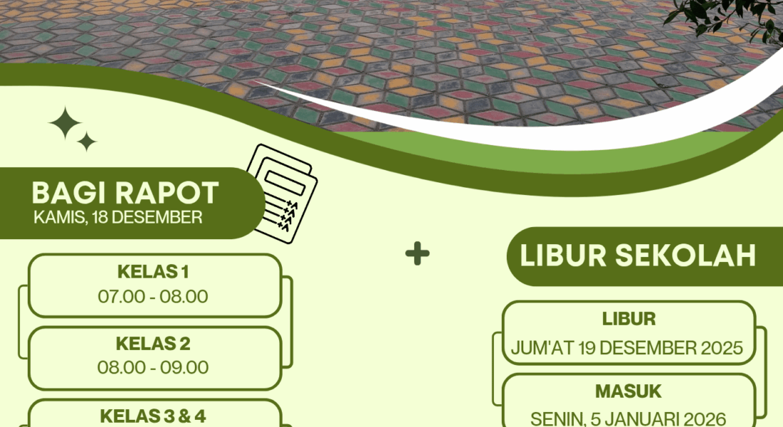 Dengan berakhirnya kegiatan belajar mengajar (KBM) di semester 1, *kami informasikan bahwa libur semester 1 dimulai pada Jum’at, 19 Desember 2025 sampai dengan Minggu, 4 Januari 2026.* Masuk kembali pada *Senin, 5 Januari 2026*