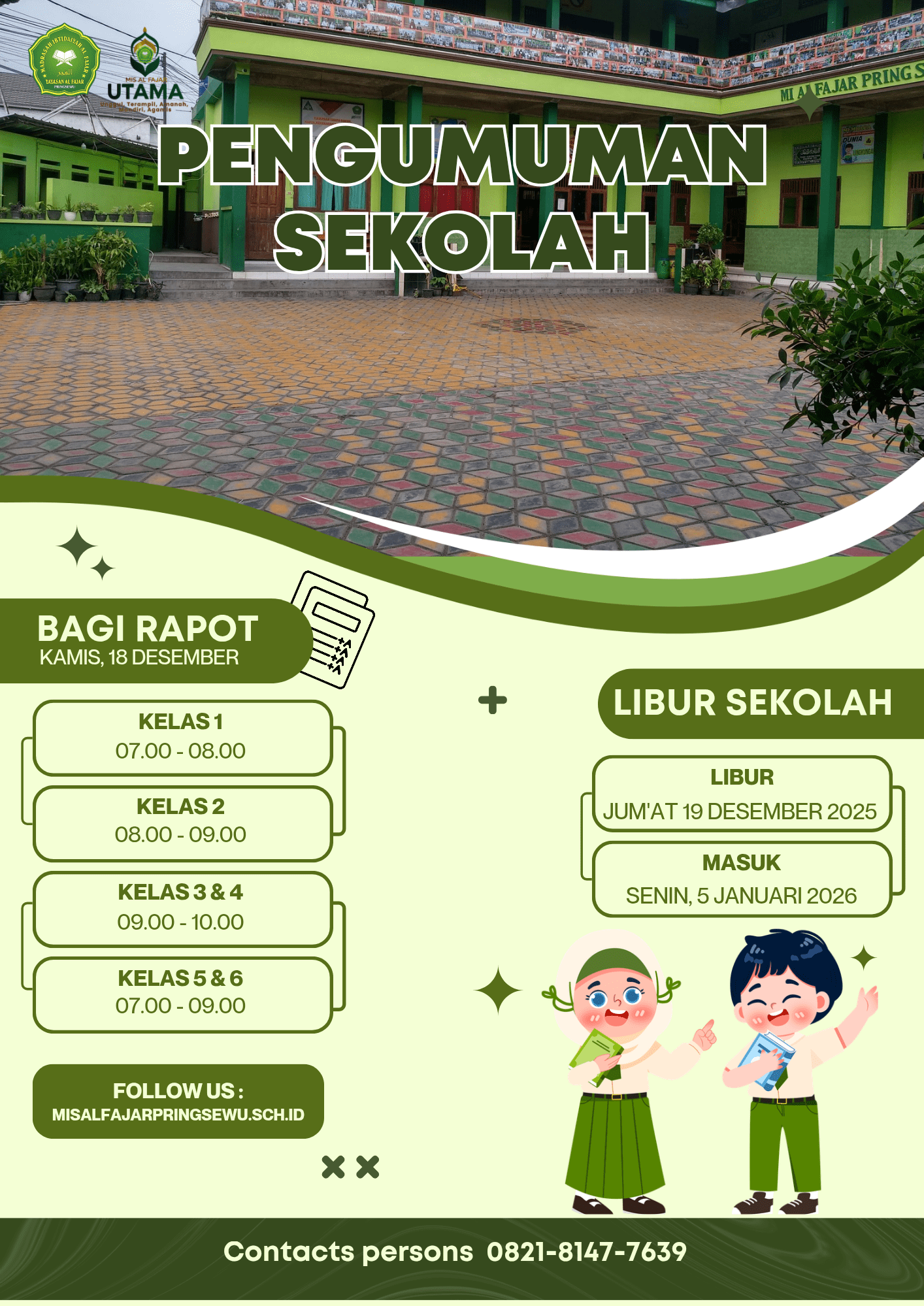 Alhamdulillah, atas izin dan pertolongan Allah Ta’ala, MIS Al-Fajar Pringsewu telah menyelesaikan rangkaian kegiatan belajar mengajar untuk semester genap Tahun Pelajaran 2024/2025. Sebagai bentuk pertanggungjawaban lembaga terhadap proses pendidikan yang telah berlangsung, kami mengundang seluruh orang tua/wali murid dalam acara Pertemuan Wali Siswa dan Pembagian Rapor Semester Genap.