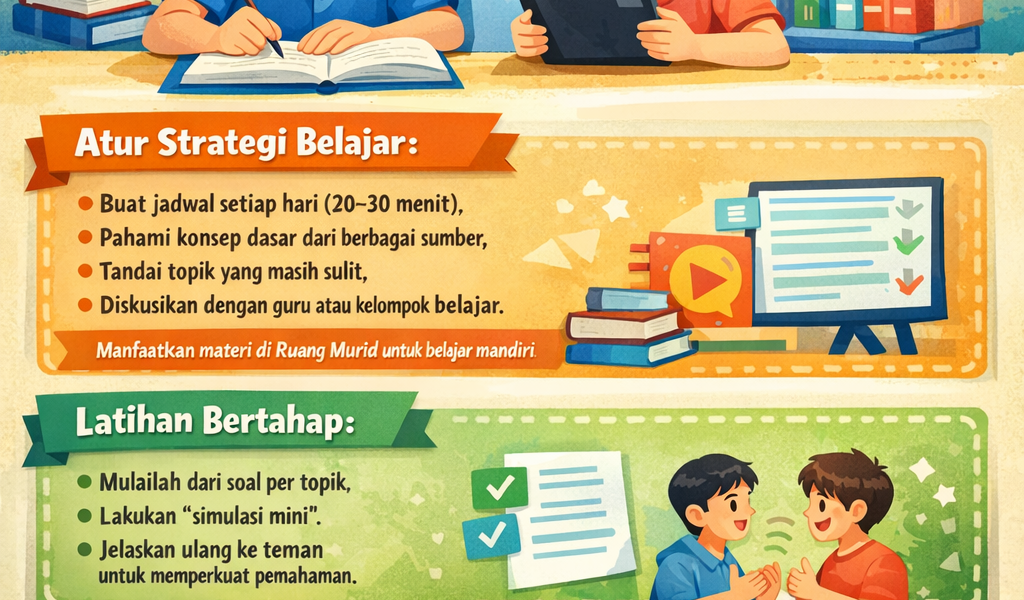 - Atur strategi belajar. Buat jadwal setiap hari (20–30 menit), pahami konsep dasar dari berbagai sumber, tandai topik yang masih sulit, dan diskusikan dengan guru atau kelompok belajar. Untuk memperkuat konsep, murid dapat menggunakan materi di Ruang Murid sebagai tambahan belajar mandiri.